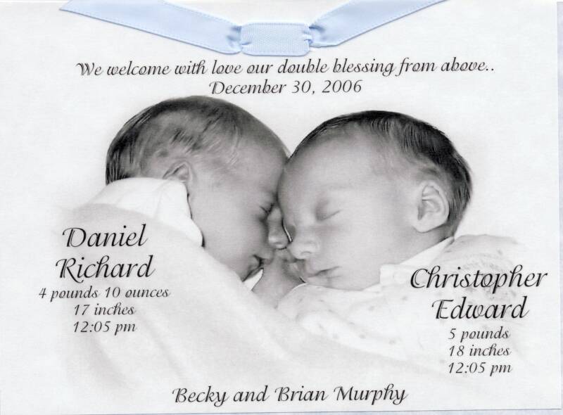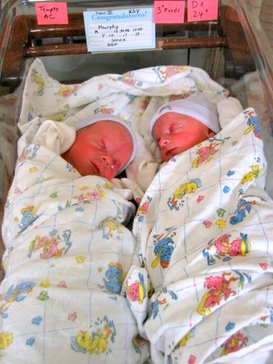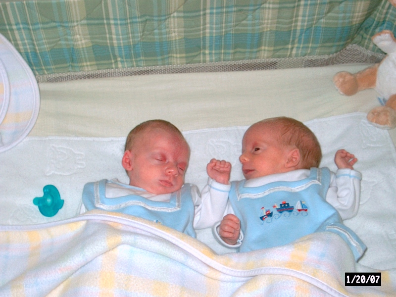We were not the biggest or smallest babies born that day (Christopher 5 lbs. 0 oz - 18 inches long - head size 13 inches and Daniel 4 lbs. 10 oz - 17 inches long - head size 13 inches (is that a big or small head size - no one seems to know) and Daniel had a few problems - low blood sugar and jaundice, but over all we were in good shape.