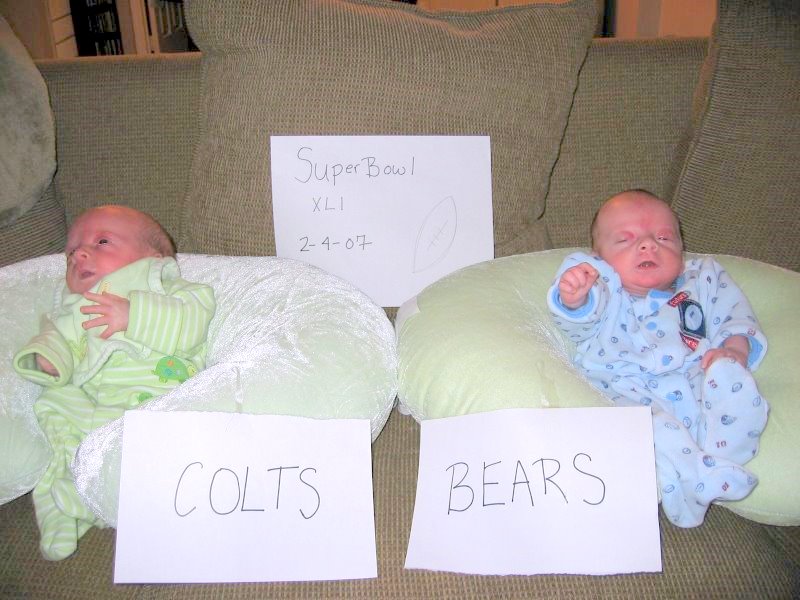 Ah, Super Bowl Sunday - Our 1st - Wings and Beer - all you need - maybe next year we will get to taste something other then formula and prune juice. We can't decide on whether to root for the "DA BEARS" or the "DA Horsies" ! but if we were betters we would put Daddy's money on "DA Horsies"