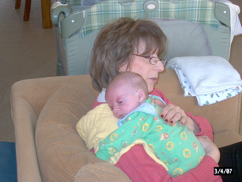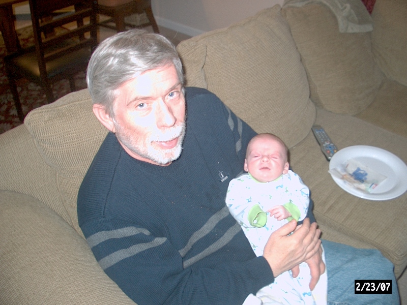 Susan and Paul left, - Paul (just like Uncle Charlie) did not want to hold me or Daniel because we were to small - SMALL, we could be tipping the scale at over 7 pounds.  Then Uncle Scott went home and Grandma, Daddy and Pop-E were talking and watching TV when all a sudden it dawn on me that I had been duped and started to be fidgety. Since they did not want me to wake Daniel up, Pop-E pick me up and we sat on the couch together until I fell asleep again and he put me back in the crib.