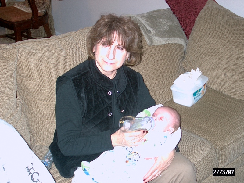 Since Daniel was sleeping, I had to keep track of things, Pop-E and Uncle Scott went out to get Pizza and a little while later the door bell rang. I thought it was Pop-E and Uncle Scott coming back with the pizza, but it was 2 strangers that I had not seem or heard before. Before you could say "HELLO" , the female was holding me. I finally realized that it was Grandma and Pop-E friends, Susan and Paul. Pop-E and Uncle Scott came back with the Pizza - they must have made it themselves since it took so long to get - and Susan thought that I had fallen asleep and she put me in the crib.