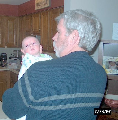 We had just finished eating and Christopher was in the crib and I was just hanging out with Mom and Dad, when Grandpa showed up -  again. Since Christopher was sleeping I got to be held by Grandpa again - Oh that sweet smell of Grandpa - not as nice as Mommy but certainly better than Daddy before he showers. Christopher does not know what he is missing - spoke to soon - now I am in the crib and Grandpa is holding Christopher. It may be the 1st time since we left the hospital.