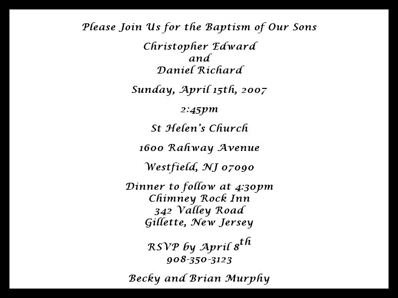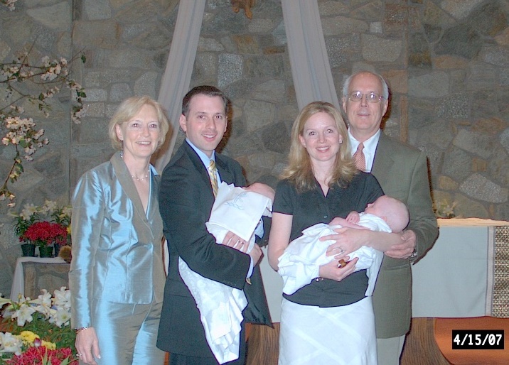 A few notes on the day: Our Christening was on April 15th - tax day - so we will never forget it. It is also our Great Aunt Maureen's birthday. It was the most rain in a day in NJ since - only God knows that and it was the same type of weather the day Daddy graduated from Fairfield and when Mommy and Daddy got engaged. We guess the expression "RAIN IS GOOD LUCK" is very true. We will like to thank everyone for making this day very SPECIAL.