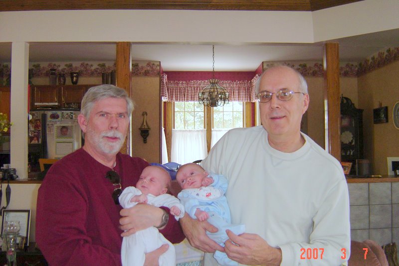 Any way he is supposed to stop over tomorrow on the way to Grandma and Pop-E's. He is going to sleep there since he has to be the airport at 4am (for a 6am flight) and Pop-E volunteered to take him. Pop-E must have had a "major" senior moment when he volunteered for that. Pop-E stopped over to show Mommy the Christening Invitation he is working on and also of course, to see us. While he was there, Grammy took a picture of both, PopPop and Pop-E and the 2 of us (the 1st picture of the 4 of us together). Do you know who is holding who?