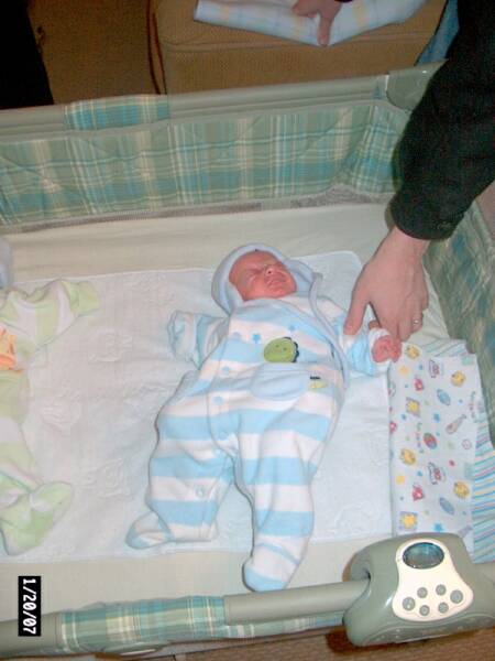 The rest of the night was a bit hazy, with both Daniel and I sleeping in the cribs, but it appears that Mommy and Daddy have this new plan that when it is night time and we wake up to eat, they have all the lights out and do not talk so that we think we should be sleeping. So Daddy, Grandma and Pop-E sat in the living with the TV on MUTE and whispering quietly waiting for Daniel and me to wake up for out next feeding which should have been about 11:30 or 12 midnight.