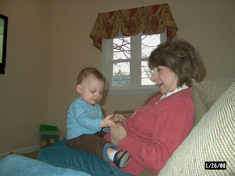 Daniel woke up 1st and guess who came up to get him out of his crib - Pop-E. Well you know how Daniel is - smiles at everyone, especially if you are going to take him out of his crib. When I woke up, who was waiting to take me out of my crib - Grandma. Now since I am shy - I sometimes cry when I see people - ever Grandma and Pop-E - but this time I just put my arms up so that she would take me out of my crib