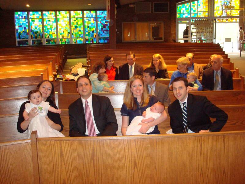At the ceremony, I was very good, because Pop-E was holding me and feeding me snacks - Pop-E always has Snacks. Grammy was holding Daniel - of course, Pop-E was also giving him snacks - but he was not feeling well. Anyway after the ceremony, we all headed back to Grandma and Pop-E for eats, drinks, desert and of course the group pictures. Look at Uncle Greg trying scare us.