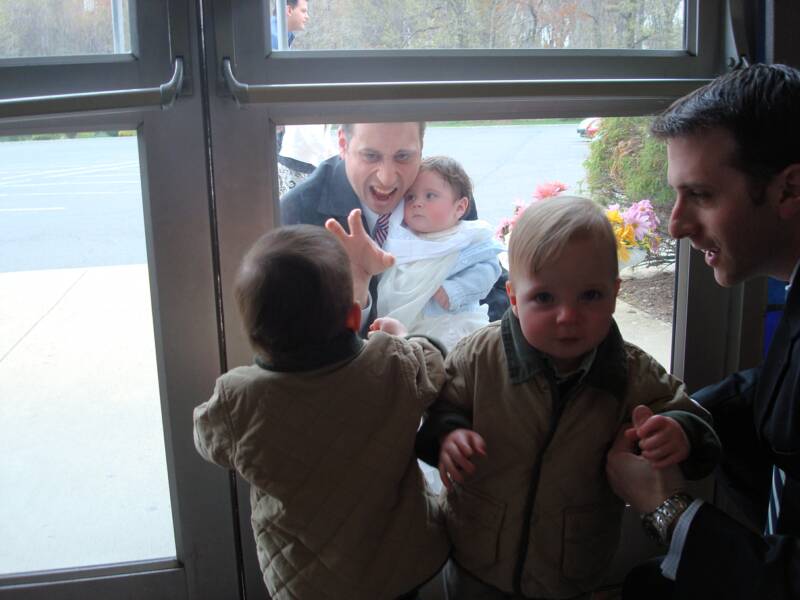 Today, both Luke and Jake are going to be Christening at St Helen's by Father Dom. Aunt Jess and Uncle Greg got permission from their parish in Woburn, MA and St Helen's to have Jake christened with Luke. Jake's Godparents are Mommy and Daddy and Luke's Godparents are Aunt Natalie (who was Mommy and Daddy's maid of Honor) and Uncle Scott.