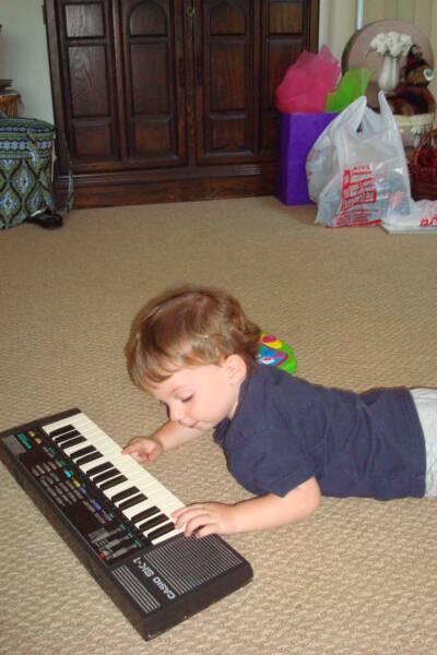 Pop-E brought a new toy that is blocks that made different vehicles and then plays the sounds they make. It is hard for us but we love it. Pop-E found a piano in the basement, that Daddy use to play with, when he was little. We love it. Here I am pounding out tunes.