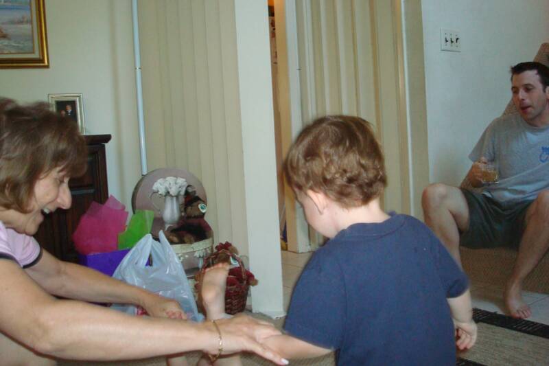 Even through Pop-E’s 65th birthday was on the 19th, MeMa decided to have a small surprise party for him. Of course knowing Pop-E, MeMa had to make sure that Jake would be there, since Pop-E kept saying that all he wanted for his birthday was a picture of him with his 4 grandsons. Of course, Jake, Aunt Jess and Uncle Greg were there. Pop-E knew about the party because a certain nephew left a voice message saying that he could not make it. Pop-E erased the message so MeMa would not know he knew about the party. By the time the party started, Pop-E had forgot that MeMa had invited other people so he was surprised when Maria, Rob, Patrice, Bobby, Caroline, Philip, George and Alice also walked in. Pope-E did not get a picture with the 4 of us but did get one with each of us. Now all he has to do is find some software to combine the 4 pictures into ONE!