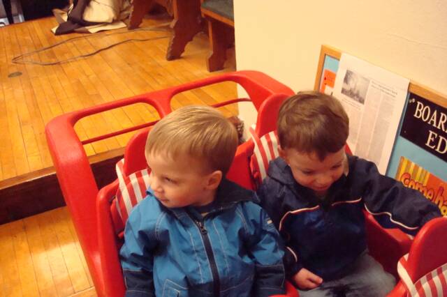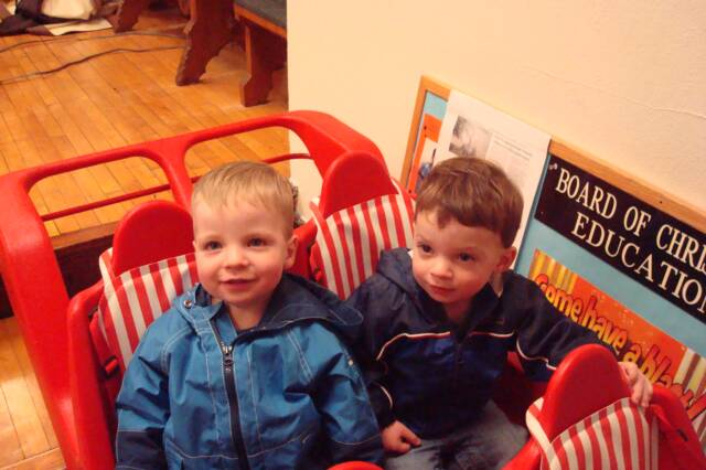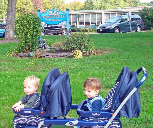 Mommy and Daddy had a wedding to go to and MeMa and Pop-E watched us. While Mommy was getting dressed and Luke was napping, MeMa and Pop-E took us for a carriage ride to see where we will be going to school when we get older. After Mommy left, we shot a few hoops, ate Boston Market and of course watched Barney. Luke started to laugh out loud. We can’t wait for him to start talking so he can tell us some of his jokes.
