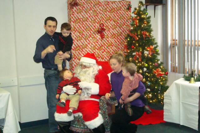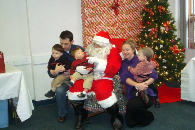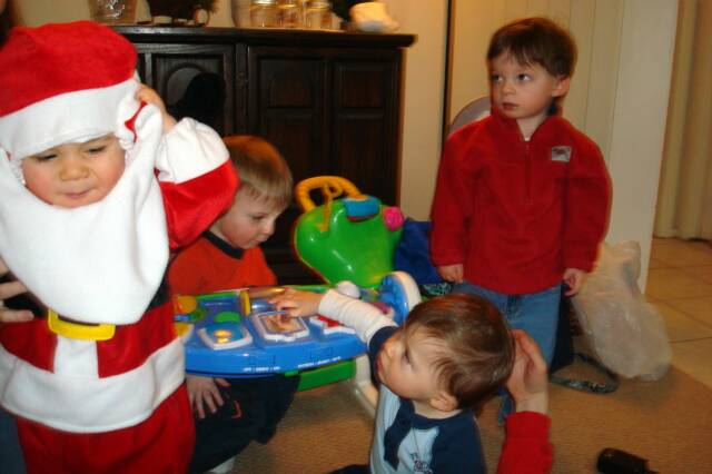 We went to St Helen’s “Breakfast with Santa” with Mommy, Daddy, MeMe, MeMa and Pop-E. PopPop was in Michigan visiting his relatives. We had pancakes, eggs, sausage, juice and cake. Then the big guy showed up in his RED SUIT and Daniel and I were heading for the exit. We finally went in to see him, but you could tell we were not enjoying it. Luke was having a ball turning his head like a top so he could get a better look at the guy in RED.